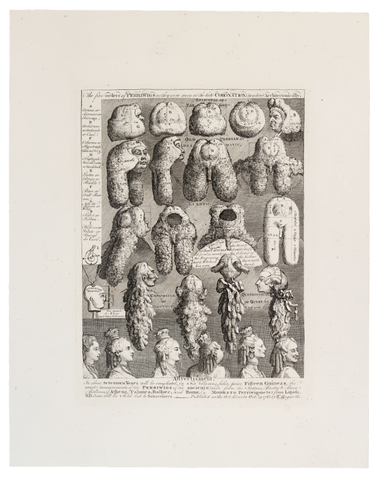HOGARTH, William. ‘The Five Orders of Perriwigs [i.e. Periwigs] as they were Worn at the Late Coronation, Measured Architectonically’. [London]: ‘Octr. 15. 1761 … W: Hogarth’ [?but John Boydell, c. 1790-1818].