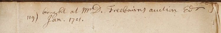 This copy is bound in limp vellum, which appears to predate its sale by auction by David Freebairn in Edinburgh in January 1701, when it was purchased by the Scottish book collector John Trotter of Mortenhall. The upper flyleaf bears his purchase inscription, which is typical of those found on other books from the Trotter family library purchased in his lifetime, such as the Clark Library’s copy of Guy Miege’s The English Grammar (London, 1691), ‘bought from George Mesman bookseller in Edinr. ye 20 Jan [16]95’; King’s College, London’s copy of Dissertationum ludicrarum et amoenitatum scriptores varii (Leiden, 1638), ‘Cost 10. d at Dr. Scattergoods auction London aug. 1697’; and the University of Pennsylvania’s copy of Aristotelis liber, qui decimus Historiarum inscribitur (Paris, 1584), ‘Bought at an auction […] in Jan. 1712’. It also bears the bookplate of the Trotter family of Mortonhall, which Lee considers of ‘unusual elegance’ and posits was ‘probably’ used by Thomas Trotter (1762-1793), 7th of Mortonhall. This copy probably remained in the library of the Trotter family until 1947, when there were two sales of books from the Trotter library, the first held by Christie’s (10 February 1947) and the second at Dowell’s Auction Rooms, Edinburgh (30 September 1947).