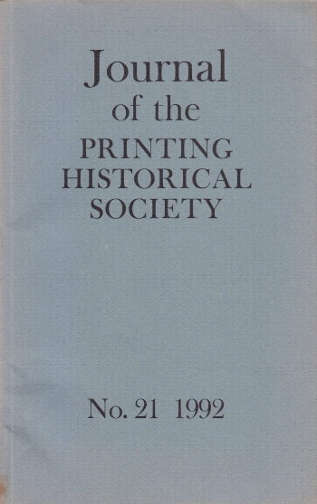 PRINTING HISTORICAL SOCIETY – Robin MYERS (editor). Journal of the Printing Historical Society. Number 21. London: Smith Settle for Printing Historical Society, 1992.